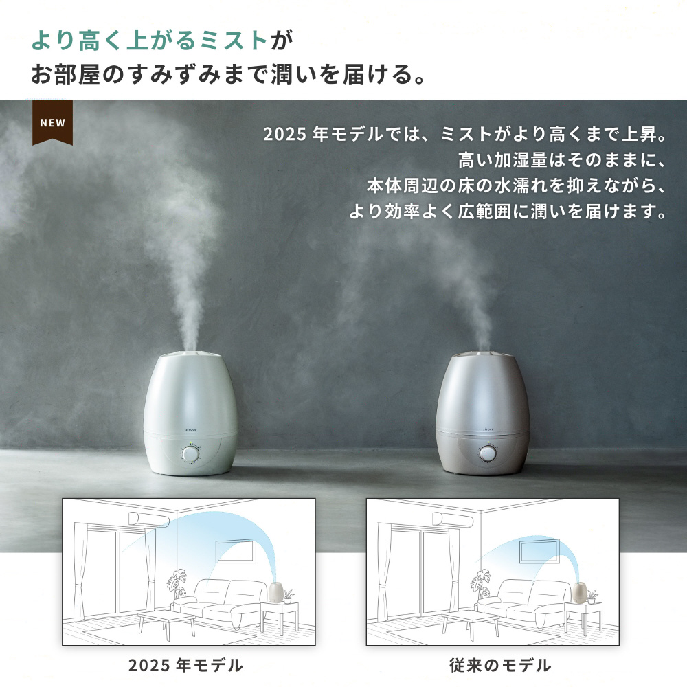 ミストを高くまで上げることで床など本体周辺の水濡れを抑え、効率よくパワフルに加湿できる一台です。