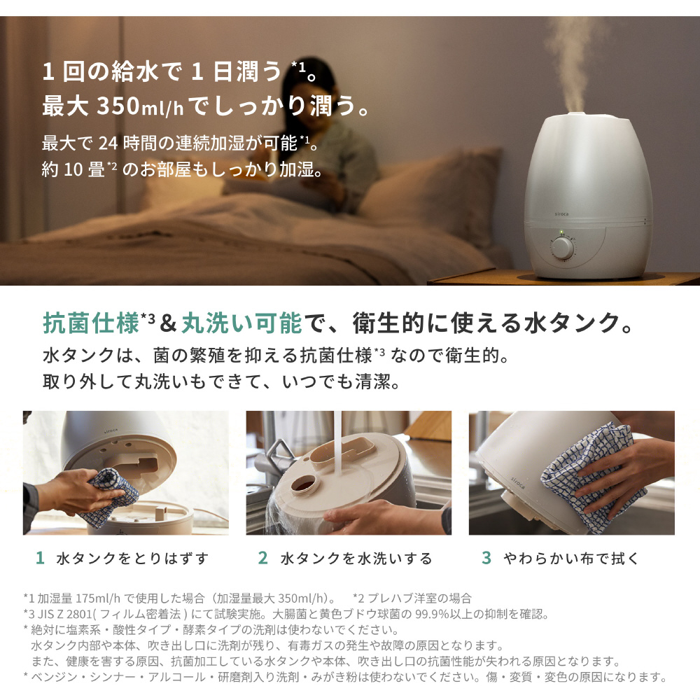 最大加湿量は350ml/h。加湿量は無段階で設定できるため、お部屋の広さや湿度に応じて調整してお使いいただけます。