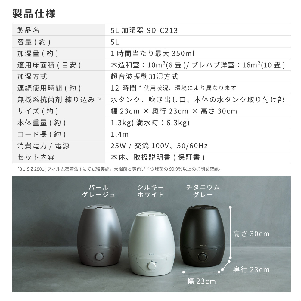 5L加湿器 siroca チタニウムグレー SD-C213HD [超音波式]
