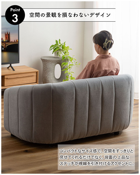 ●ソファ背もたれの正面から背面にかけて施された縦ラインのステッチが視線を引きつけるアクセントとなり、インテリアの主役として存在感を放ちます。