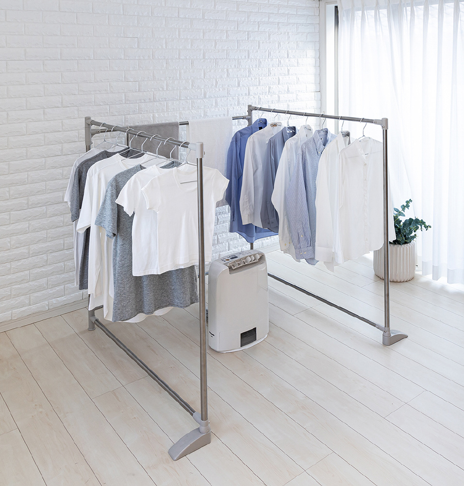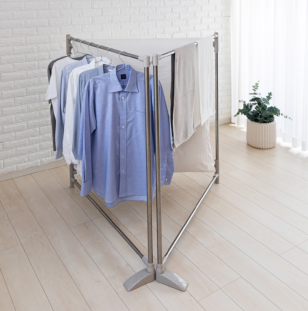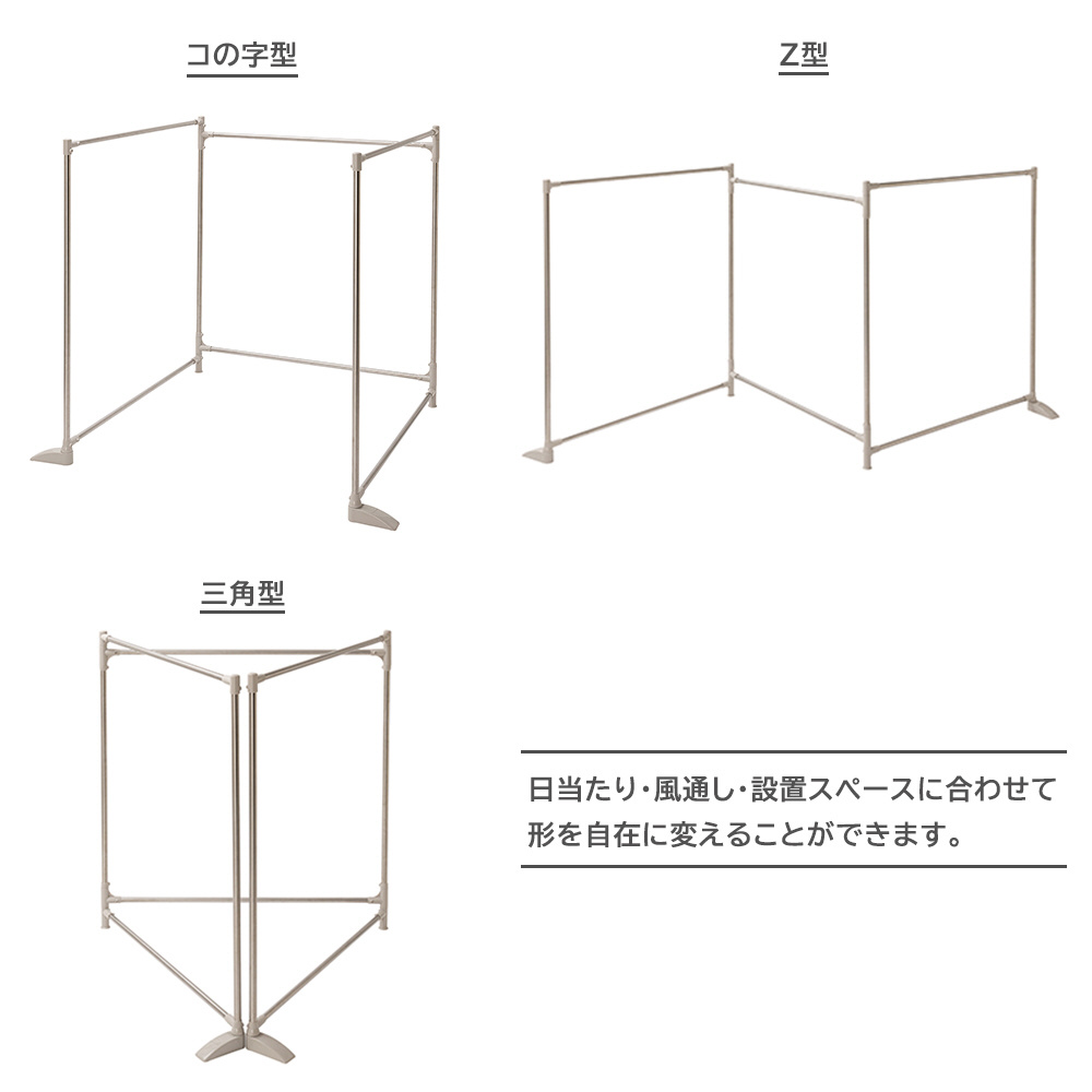 Z型・コの字型・三角、3つの形状に変形可能。コンパクトにすれば省スペースに部屋干しできます。