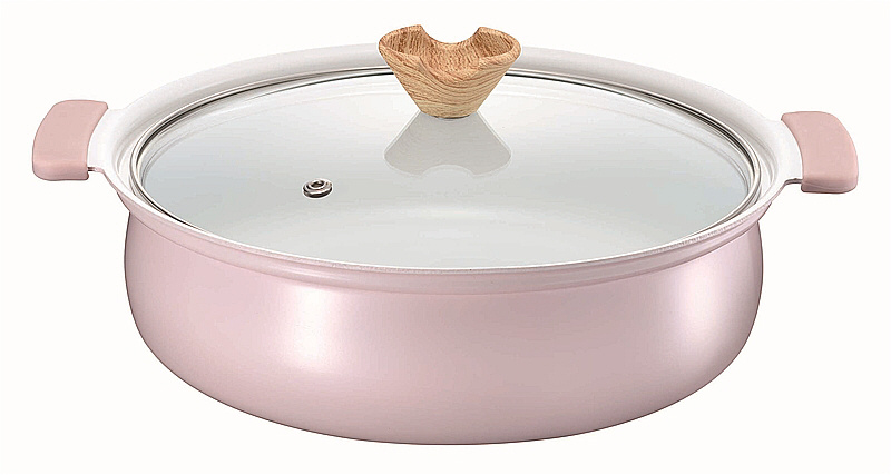 仕様2 材質:本体=アルミニウム合金(内面セラミックコーティング・外面焼付塗装)、はり底=18-0ステンレス、取手カバー=シリコーン樹脂、フタ=全面物理強化ガラス、つまみ=フェノール樹脂(木目調シリコーンコーティング)