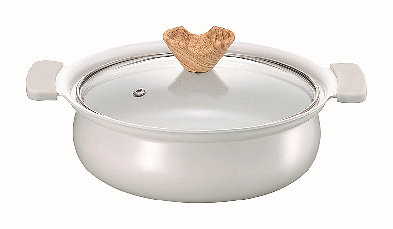 仕様2 材質:本体=アルミニウム合金(内面セラミックコーティング・外面焼付塗装)、はり底=18-0ステンレス、取手カバー=シリコーン樹脂、フタ=全面物理強化ガラス、つまみ=フェノール樹脂(木目調シリコーンコーティング)