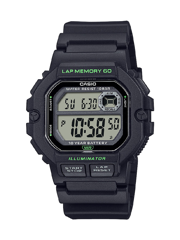 ヘビーデューティな角型ケースに、ランニング中でも視認しやすいデジタル表示、ストップウオッチ計測に便利なフロントボタンを採用。
