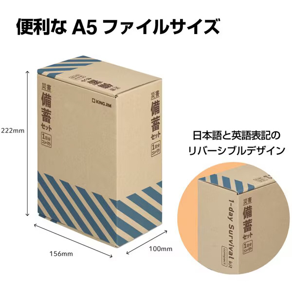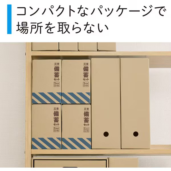 A5サイズのコンパクトなパッケージに保存水やクッキーなどがセットされた防災用品です。さまざまなニーズに合わせて10種類以上のラインアップから必要な防災用品を選べる「災害対策セット」シリーズと共に、キャビネットやデスクのわずかなスペースで防災用品を備蓄できます。