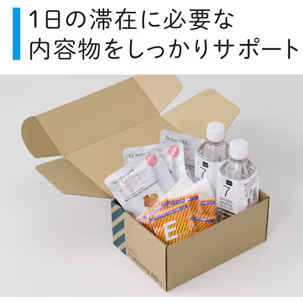 一時的な非難を支援するための定番アイテムが同梱されています。500mllの飲料水が2本、クッキーが3本同梱されており、どちらも賞味期限は6年間です。また、非常用簡易トイレも5個同梱されており、避難や長時間の待機となった場合にも安心です。