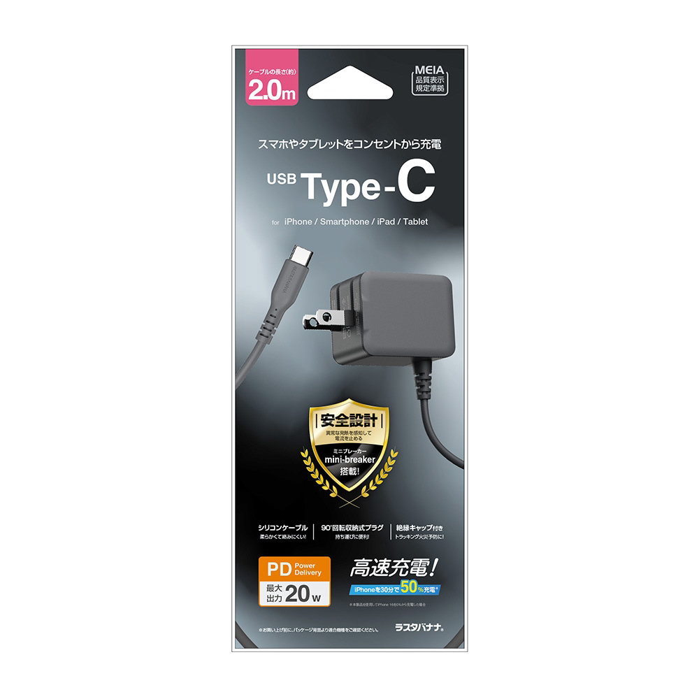 充電器 ACアダプター AC充電器 タイプC PD パワーデリバリー 20ワット ケーブル直付 mini-breaker付 2.0メートル USB Type-C typec 20W Power Delivery 2.0m チャコールグレー iPhone iPad スマホ タブレット