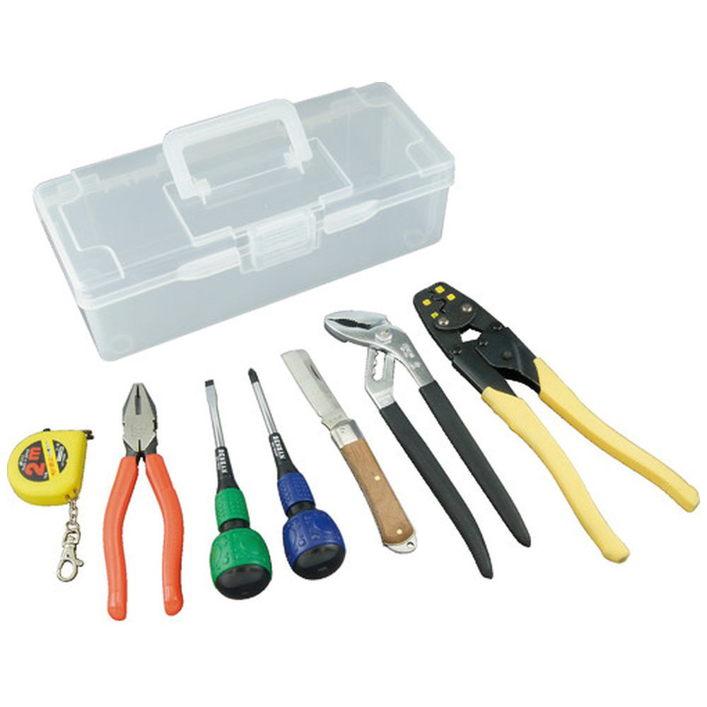 ・セット内容(各1個)・成型カバー付ペンチ NP-175・圧着工具(VAスリーブ用)DC-17A・ウォーターポンププライヤ・クッショングリップドライバー(+)DC-909P・クッショングリップドライバー(−)DC-909・電工ナイフ DK-660B・電工プロメジャー JPM-2555STP・キャリングケース