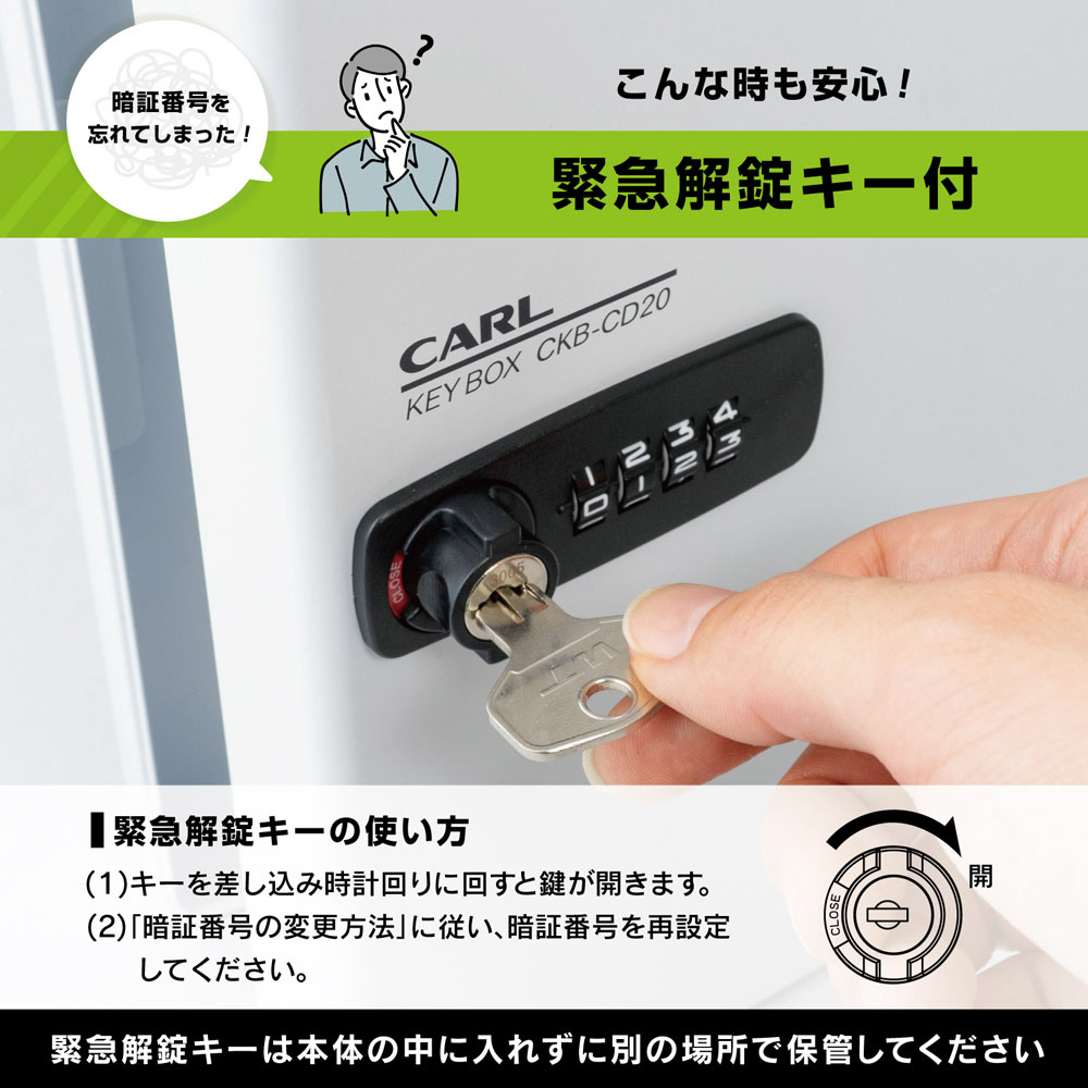 保管の際は便利な4桁暗証番号ダイヤル式ロックで施錠できます。暗証番号を忘れた際緊急解除キーで解除し暗証番号の再確認、再設定が可能です。