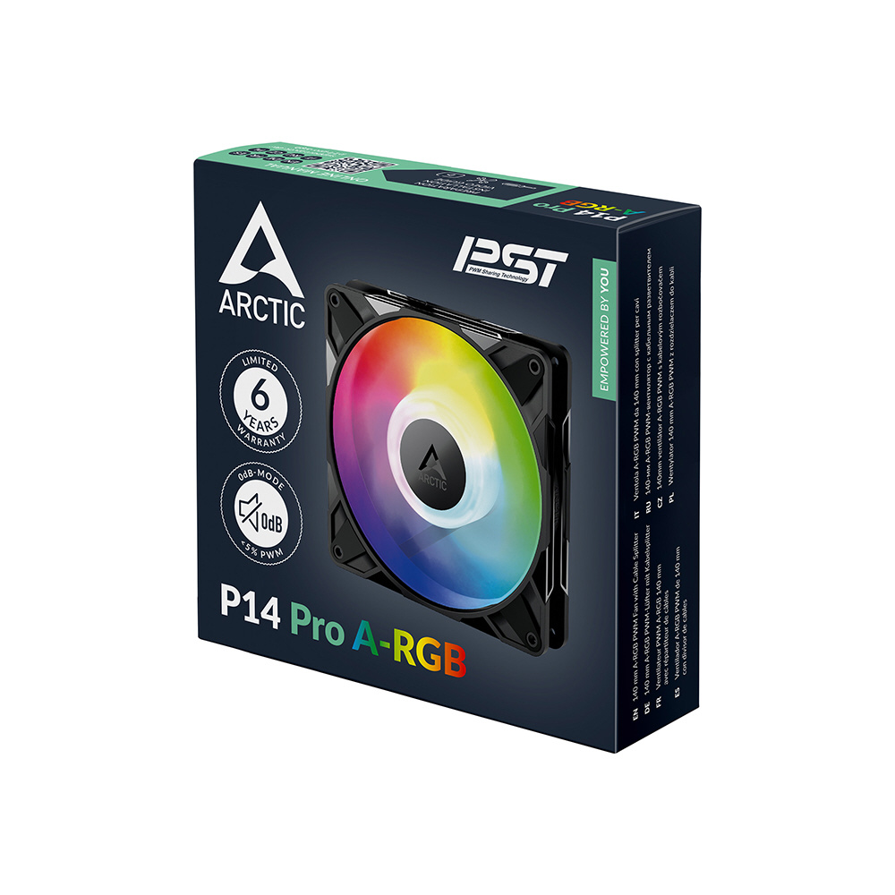 ワイドレンジ仕様のPWMファンP14 Pro PST ブラック ARGB。400〜2500rpmの回転数により低エアフローから高エアフローまで幅広く対応。