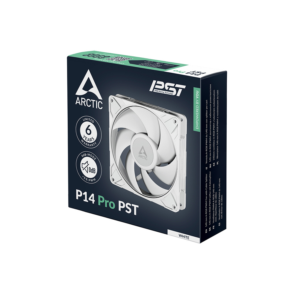 ワイドレンジ仕様のPWMファンP14 Pro PST ホワイト。400〜2500rpmの回転数により低エアフローから高エアフローまで幅広く対応。