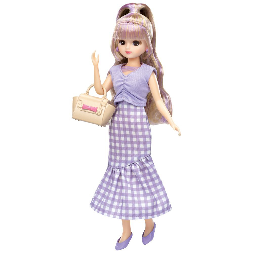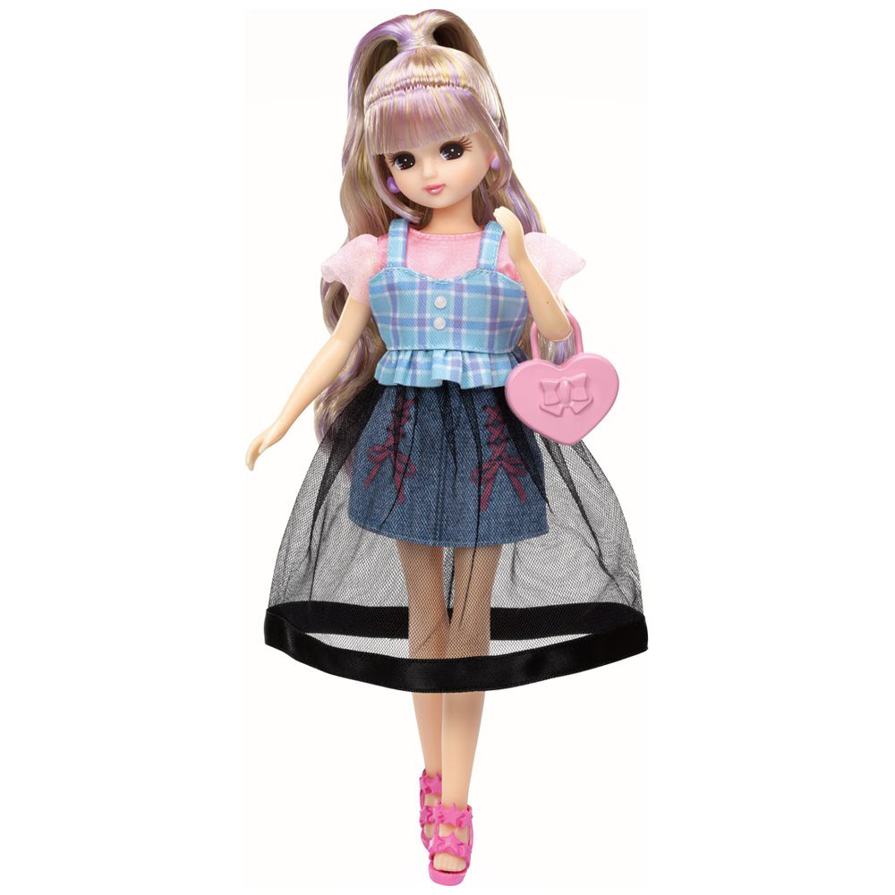 ピンクのトップスとデニムスカートを合わせたコーデのリカちゃんに、