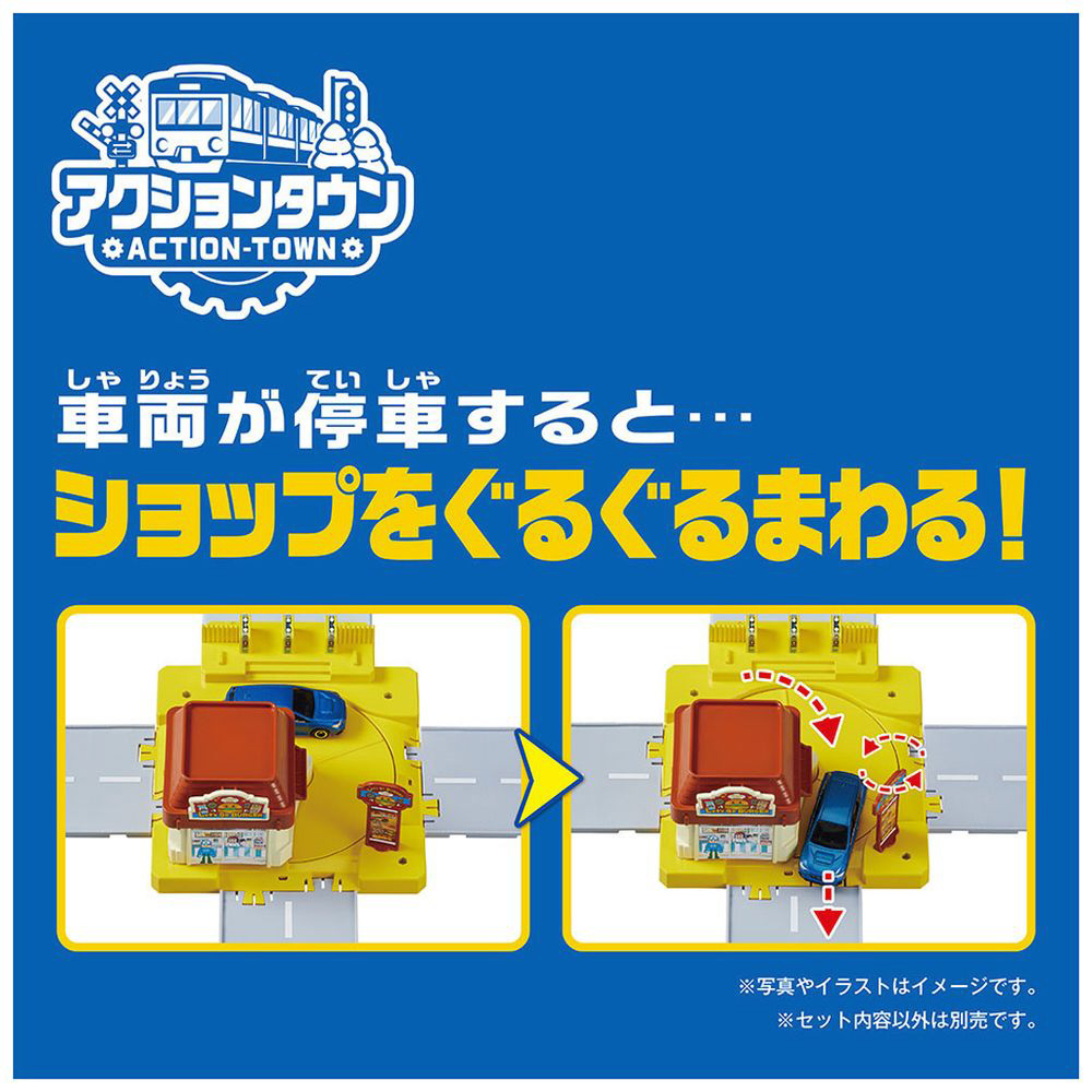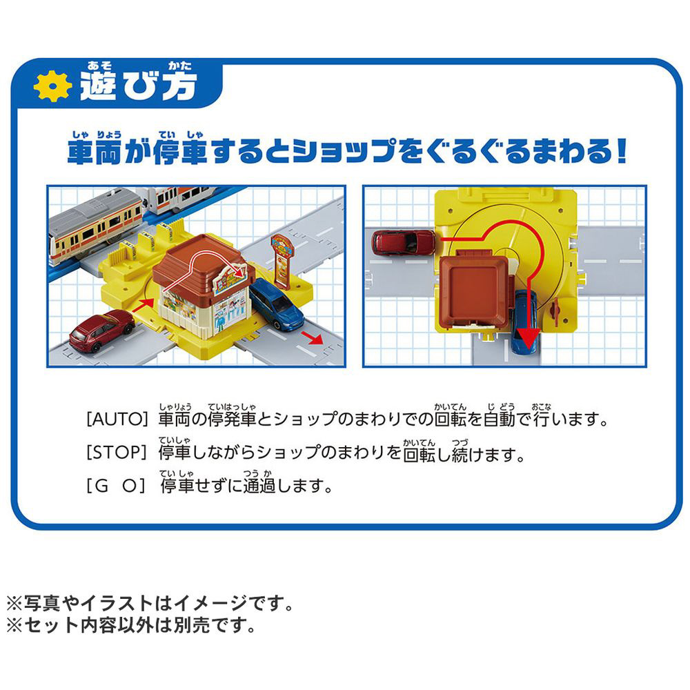 車両が到着すると停車し、ロータリーが回転してショップのまわりをトミカが回転します。