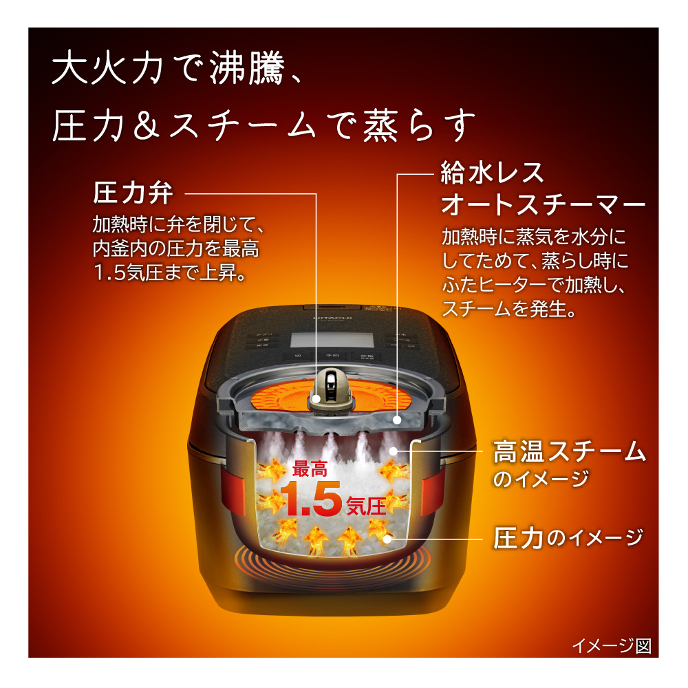 圧力&スチームの日立!最高1.5気圧の大火力で沸騰、圧力&スチームで蒸らす。米老舗八代目儀兵衛の土鍋釜の炊き技を炊飯器の技術で実現。