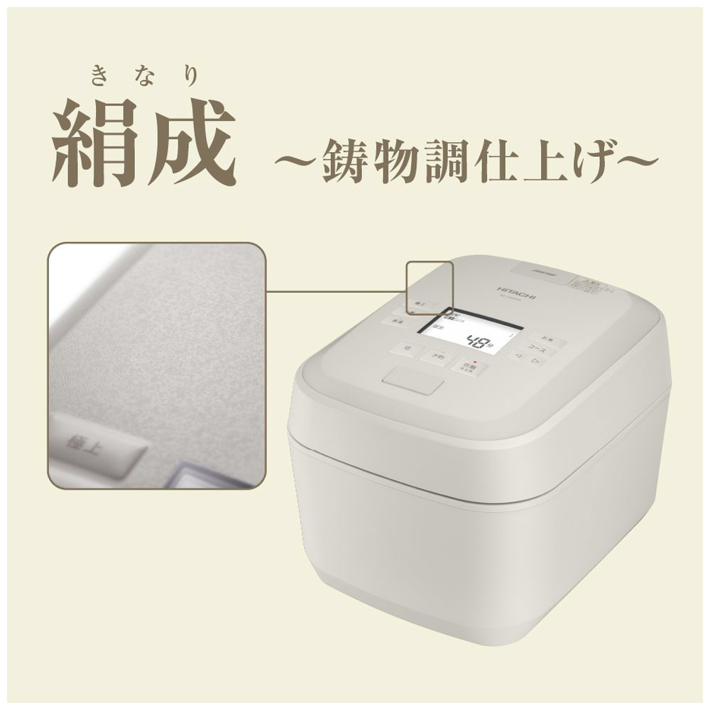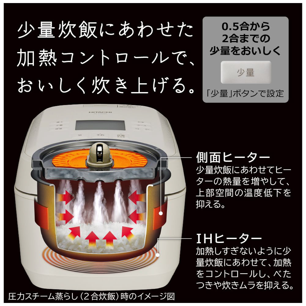 圧力&スチームの日立!最高1.5気圧の大火力で沸騰、圧力&スチームで蒸らします。米老舗八代目儀兵衛の土鍋釜の炊き技を炊飯器の技術で実現。輪郭のある粒立ちはそのままに、中はさらにやわらかい仕上がり(※1)。甘みがじわっと広がりのどをすっと通る、もう一膳欲しくなるおいしさ。