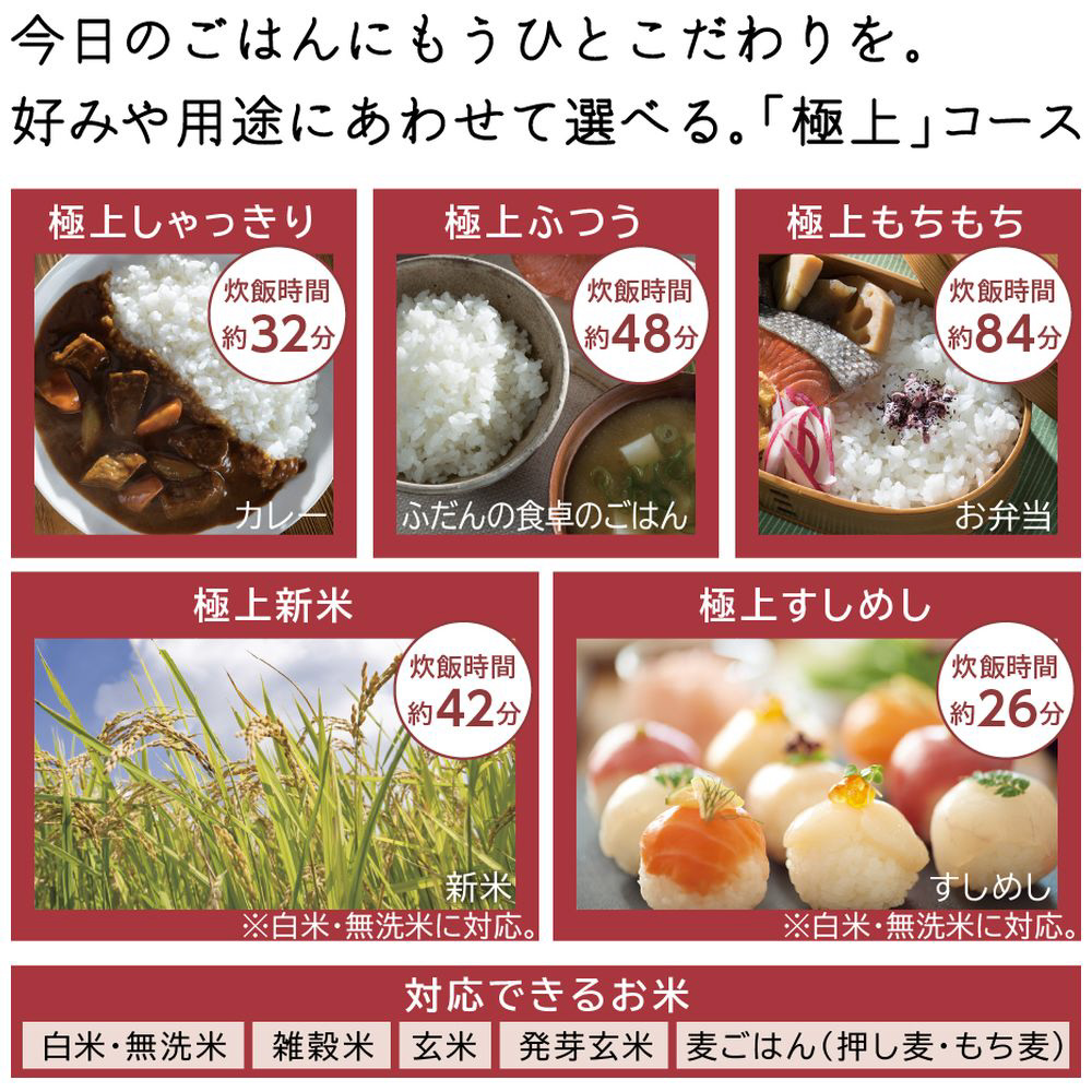 少量炊飯に合わせた加熱コントロールでおいしく炊き上げます。極上コースなら少量炊飯時でもお好みの炊き上がりを選べます。