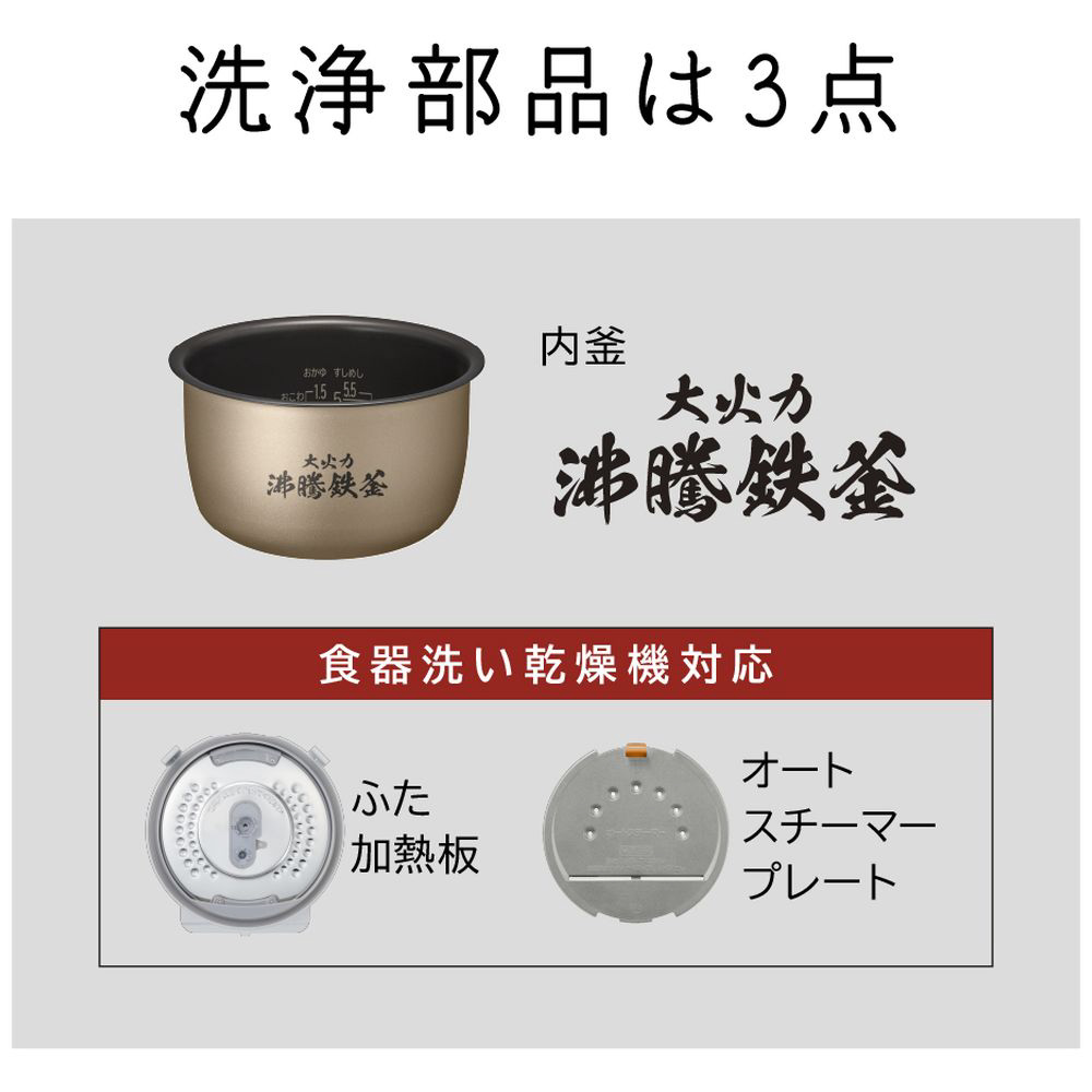 洗浄部品は3点。ふた加熱板とオートスチーマープレートは食器洗い乾燥機対応です。