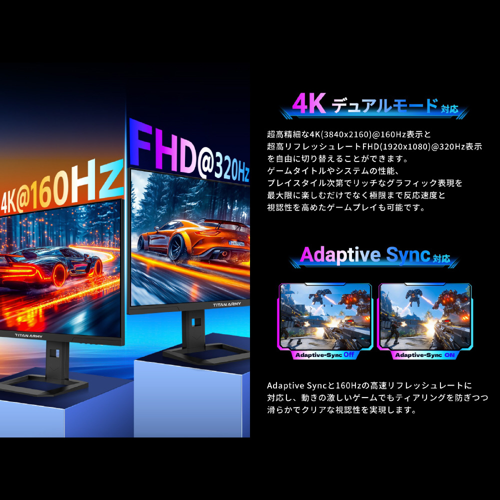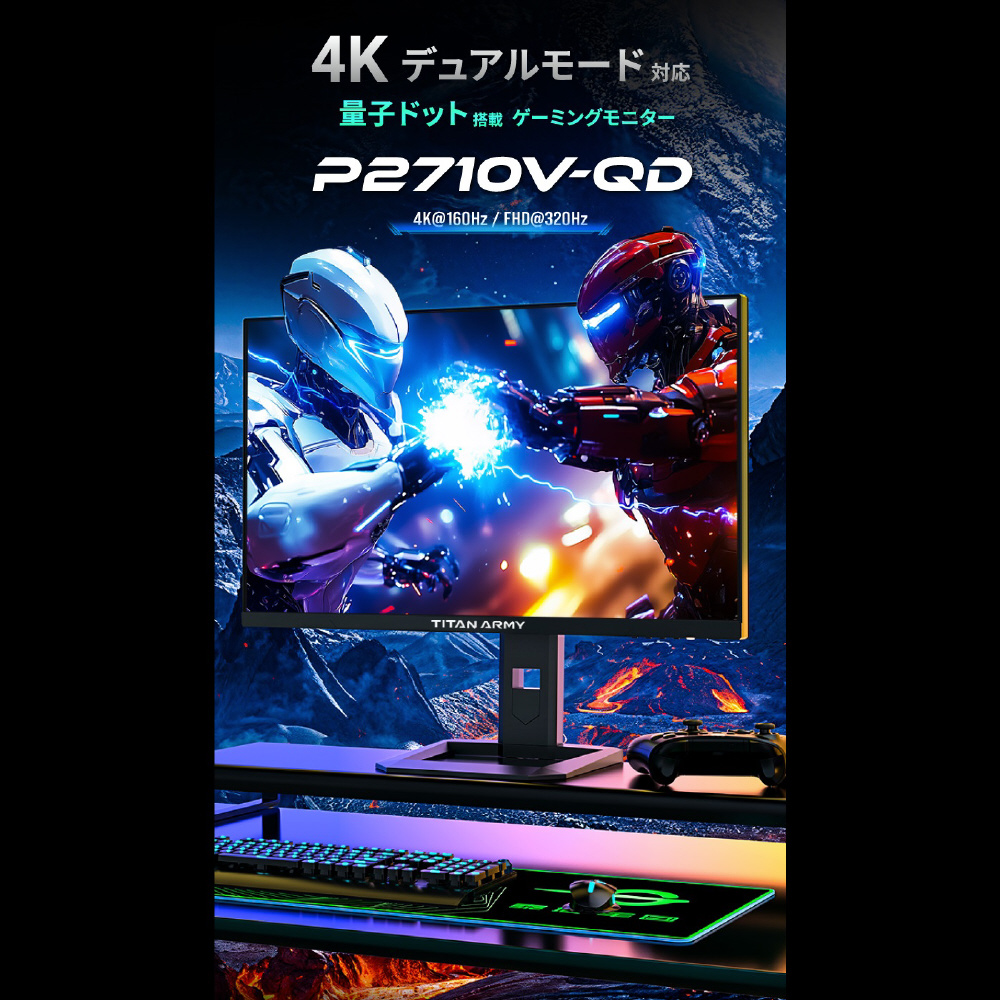 Titan Army P2710V-QDは量子ドット技術を搭載した27型160Hz対応のゲーミングモニターです。4K(3840×2160)の高解像度とDCI-P3 99%、Adobe RGB 99%の広色域に対応します。4K@160Hzだけでなく、FHD@320Hzでの超高リフレッシュレートでの動作が可能なデュアルモードを搭載し、快適なゲームプレイを実現します。