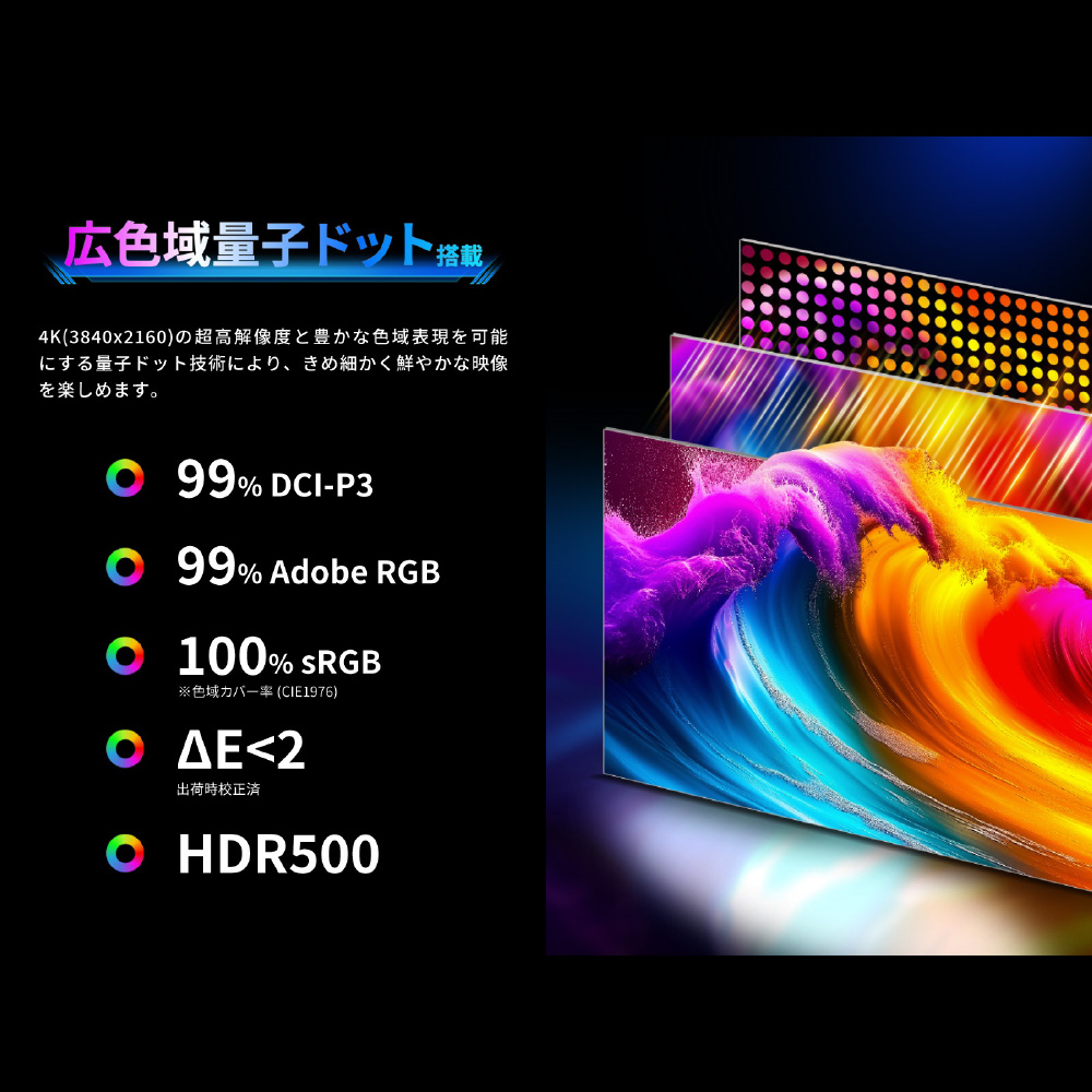 量子ドット技術により従来のモニターでは弱点だった緑や赤の発色を改良し、DCI-P3 99%、Adobe RGB 99%の広色域に対応、ゲームプレイのみならず画像編集、動画編集にも最適です。工場出荷時に各個体へキャリブレーションを実施し、ΔE<2となる誤差の少ない正しい色を映します。