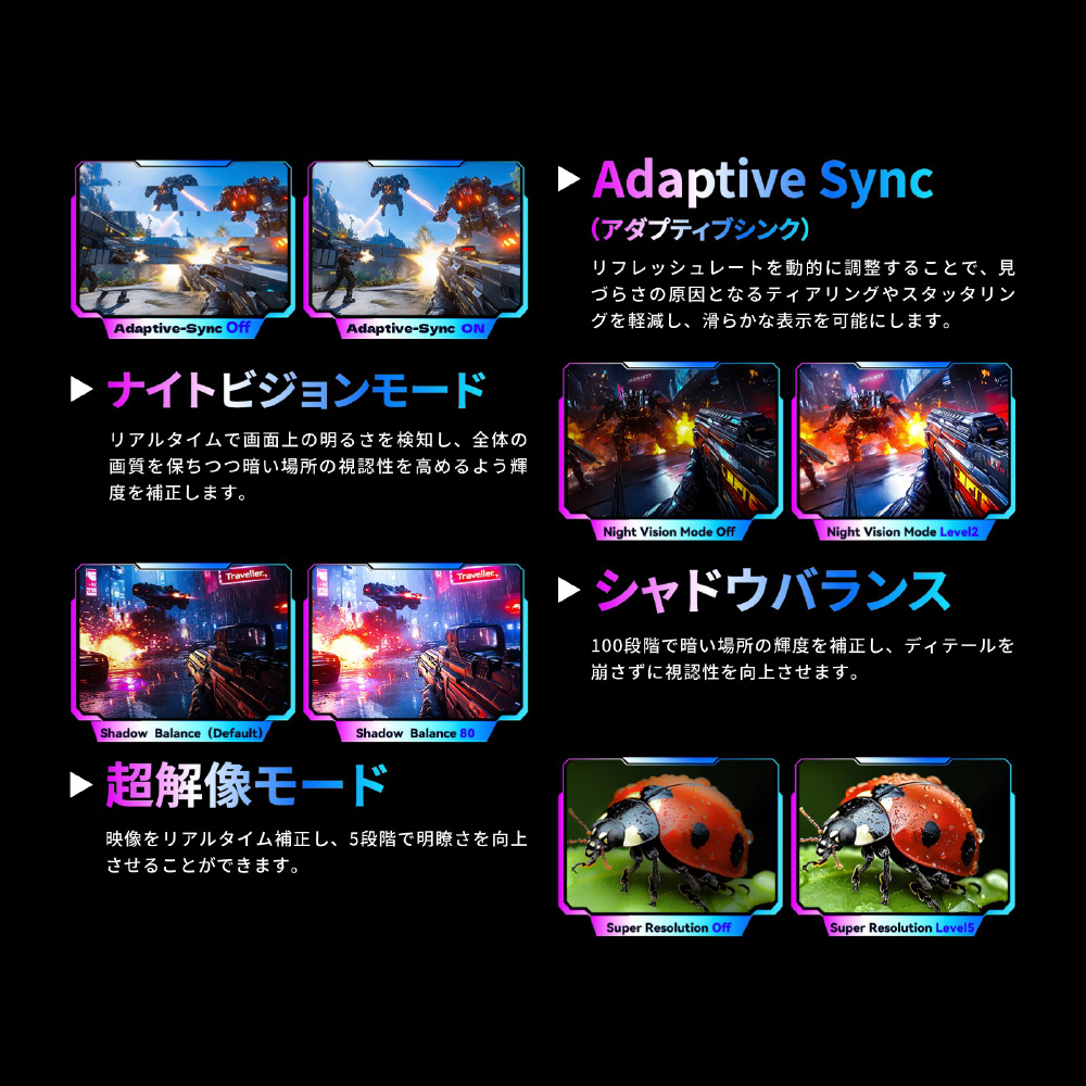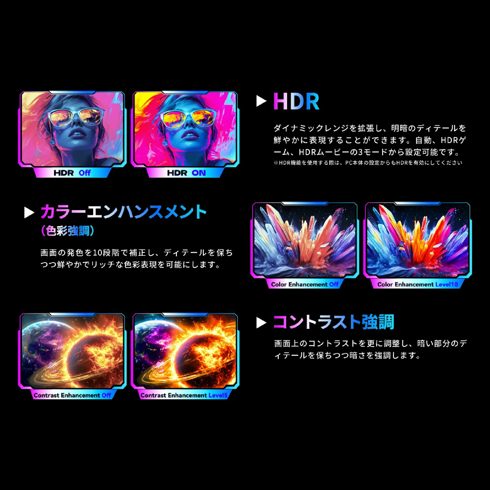 明暗のディテールを強調し、さらに鮮やかな映像を楽しめるHDR機能をはじめ、ゲームプレイやグラフィックを最大限に楽しむための支援機能を多数搭載しています。