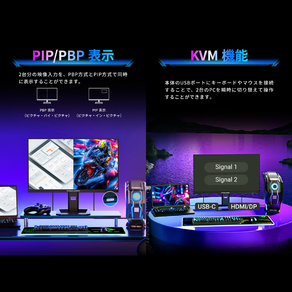 2台のPCやゲーム機を分割表示するPBP/PIP方式に対応し、左右2分割や親画面/子画面に分割して2つの映像を同時に表示することができます。また、本体のUSBポートにキーボードやマウスを接続することで、2台のPCを瞬時に切り替えて操作することができます。