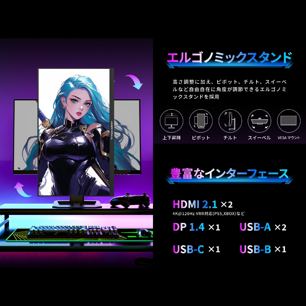 Titan Army P2710V-QDは量子ドット技術を搭載した27型160Hz対応のゲーミングモニターです。4K(3840×2160)の高解像度とDCI-P3 99%、Adobe RGB 99%の広色域に対応します。4K@160Hzだけでなく、FHD@320Hzでの超高リフレッシュレートでの動作が可能なデュアルモードを搭載し、快適なゲームプレイを実現します。HDMI 2.1ポートを2つ備え、最新の家庭用ゲーム機において4K 120Hz出力でのプレイ、VRR(可変リフレッシュレート機能)にも対応しています。また、ダイナミックOD(オーバードライブ)機能により高リフレッシュレート時の残像感、ブレを低減し明瞭な表現を楽しめます。