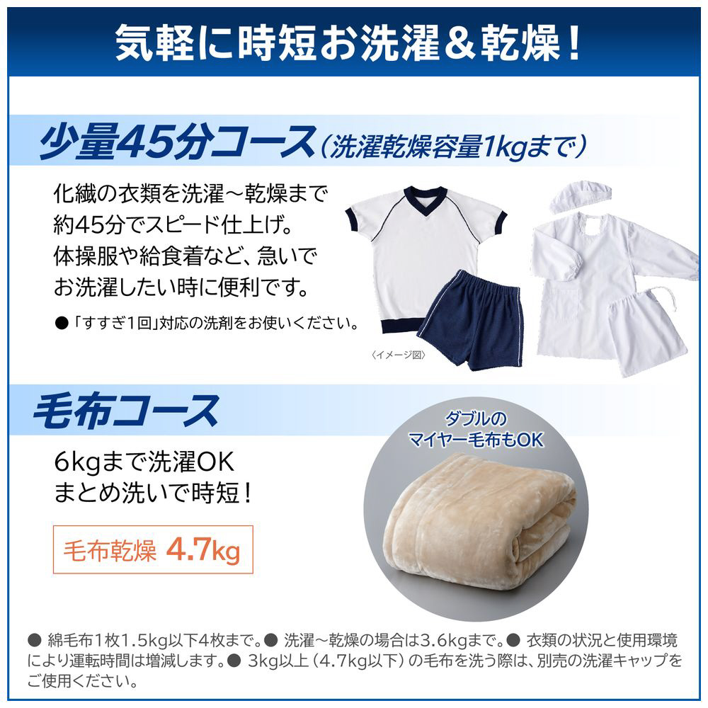 大きな洗濯槽と大風量。ヒートポンプならではのやさしい低温風が衣類を傷めず、ふんわりスピーディーに仕上げます。しかも、省エネ。