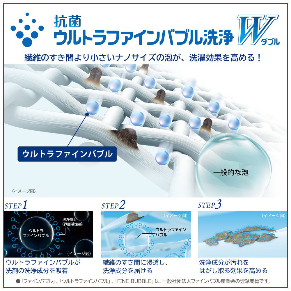 驚異の洗浄技術!抗菌ウルトラファインバブル洗浄W。いつものお洗濯で、もっとキレイに!!洗うたび抗菌!!