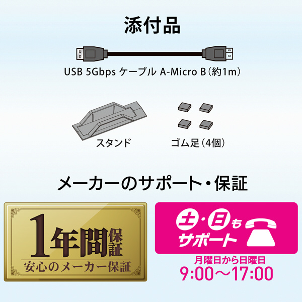 ・A-microB USB 5Gbps(USB 3.2 Gen1)ケーブル(約1m)1本