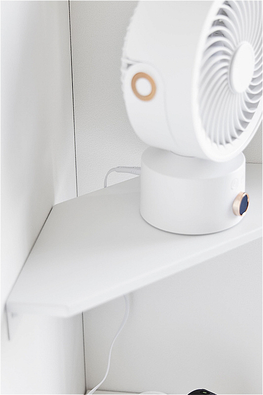 部屋のコーナーの壁に石こうボードピンで簡単に取り付けできるサーキュレーターラック。夏場に欲しくなるミニサーキュレーターやデスクファンの置き場に便利なコーナーラックです。ミニサーキュレーターやハンディーファンの置き場としてトイレのコーナーへの設置もおすすめです。電源コードは背面の隙間から通すことができサーキュレーターをお好みの高さに設置することで空気を循環させることができ電気代の節約にもなります。