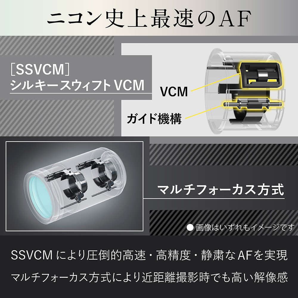 ニコン独自のシルキースウィフトVCM(SSVCM)をAF駆動用アクチュエーターとして採用したマルチフォーカス方式で、ニコン史上最速※1のAF速度を実現。従来のNIKKOR Z 24-70mm f/2.8 Sと比べ、約5倍の高速化※2を達成しています。また、ズーム操作中のフォーカス追従性能は、従来レンズに比べて約60%向上しており、動画撮影中も被写体にしっかりとピントを合わせ続けることができます。