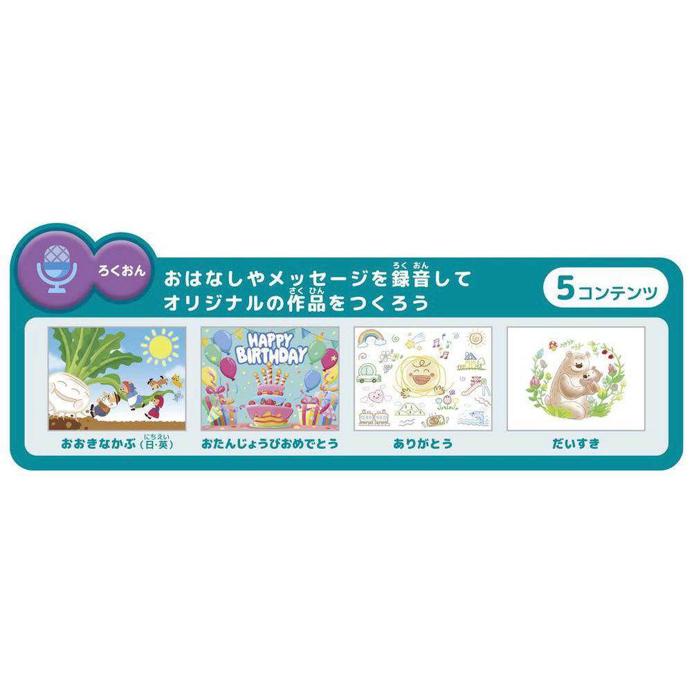 世界の名作童話を日本語と英語の2か国語で読み聞かせをしたり、ものの名前や英単語等が学べる知育コンテンツ等で楽しめます。