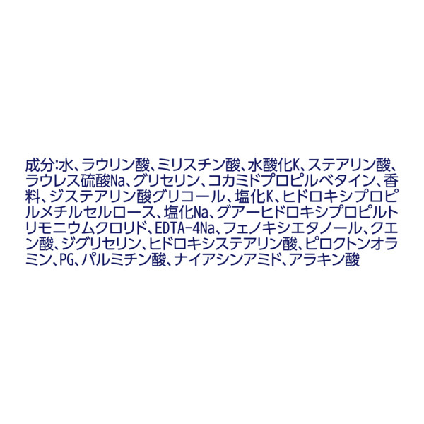 水、ラウリン酸、ミリスチン酸、水酸化K、ステアリン酸、ラウレス硫酸Na、グリセリン、コカミドプロピルベタイン、香料、ジステアリン酸グリコール、塩化K、ヒドロキシプロピルメチルセルロース、塩化Na、グアーヒドロキシプロピルトリモニウムクロリド、EDTA-4Na、フェノキシエタノール、クエン酸、ジグリセリン、ヒドロキシステアリン酸、ピロクトンオラミン、PG、パルミチン酸、ナイアシンアミド、アラキン酸