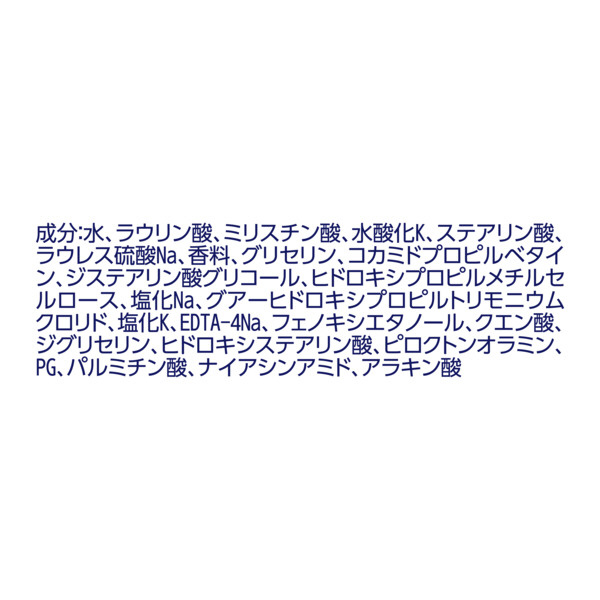 水、ラウリン酸、ミリスチン酸、水酸化K、ステアリン酸、ラウレス硫酸Na、香料、グリセリン、コカミドプロピルベタイン、ジステアリン酸グリコール、ヒドロキシプロピルメチルセルロース、塩化Na、グアーヒドロキシプロピルトリモニウムクロリド、塩化K、EDTA-4Na、フェノキシエタノール、クエン酸、ジグリセリン、ヒドロキシステアリン酸、ピロクトンオラミン、PG、パルミチン酸、ナイアシンアミド、アラキン酸
