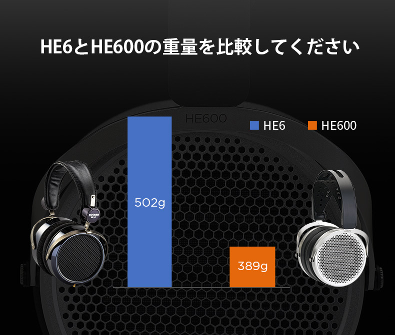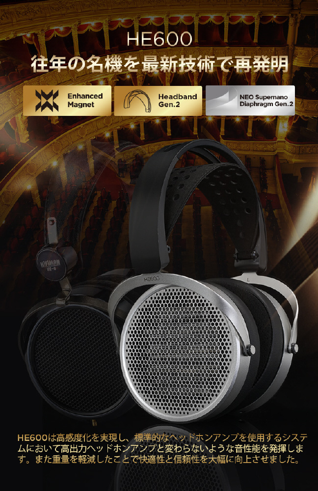 HE600ヘッドフォンは、通常のイヤーアンプ駆動でHE6とフルアンプの音色を再現し、軽量化により快適性と信頼性を大幅に向上させています。