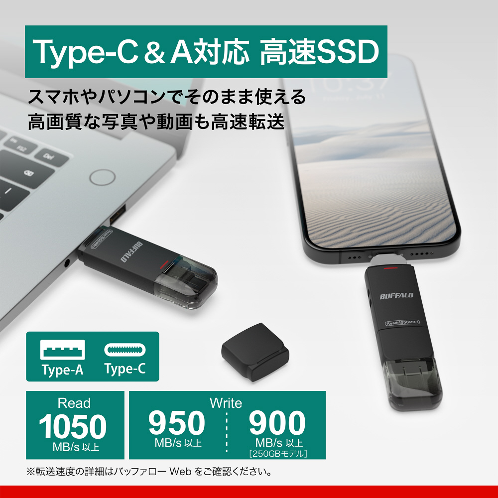本商品は USB Type-A端子とUSB Type-C端子の両方を備えています。出荷時にexFATでフォーマット済み。