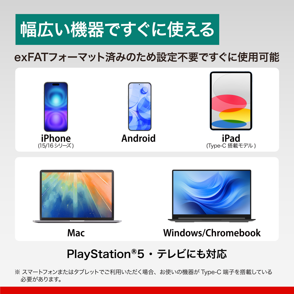 パソコンだけでなく、スマホやタブレット等さまざまな機器で、フォーマットや変換アダプター無しでそのまま使用できます。