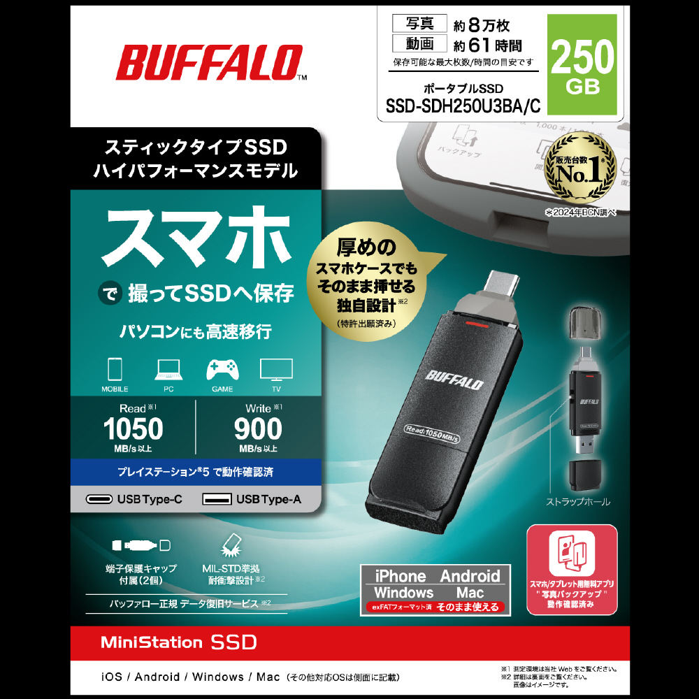 スマホの写真・動画をかんたん保存◎Type-CとA両対応のコンパクトなスティック型SSD