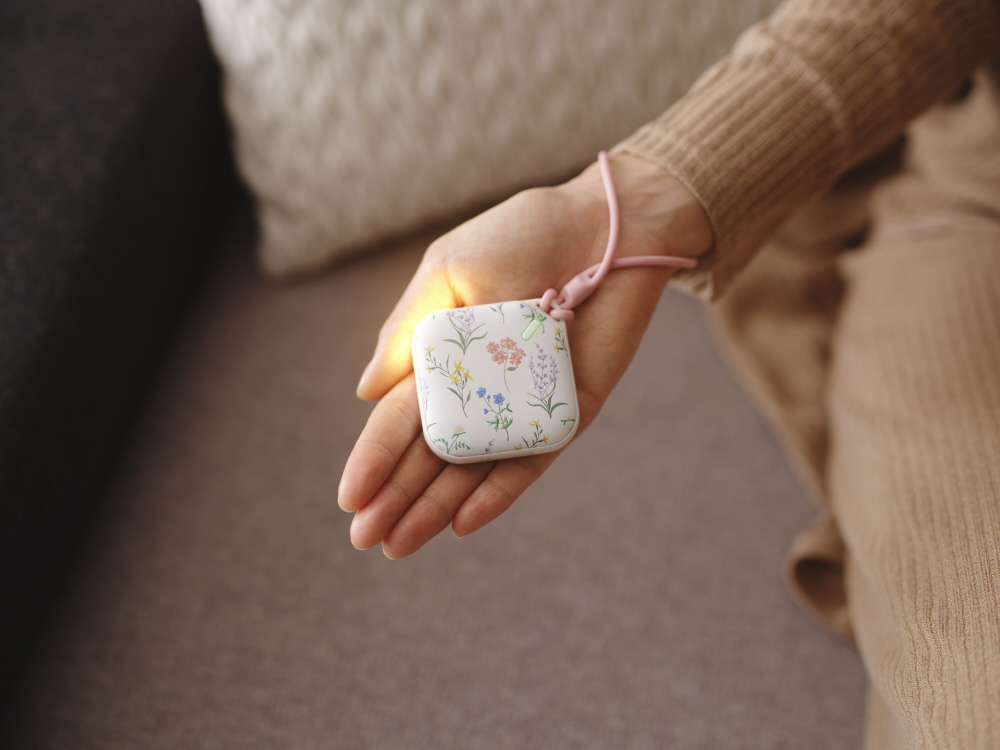 手のひらに収まるコンパクトサイズのLEDライト付き充電式カイロ