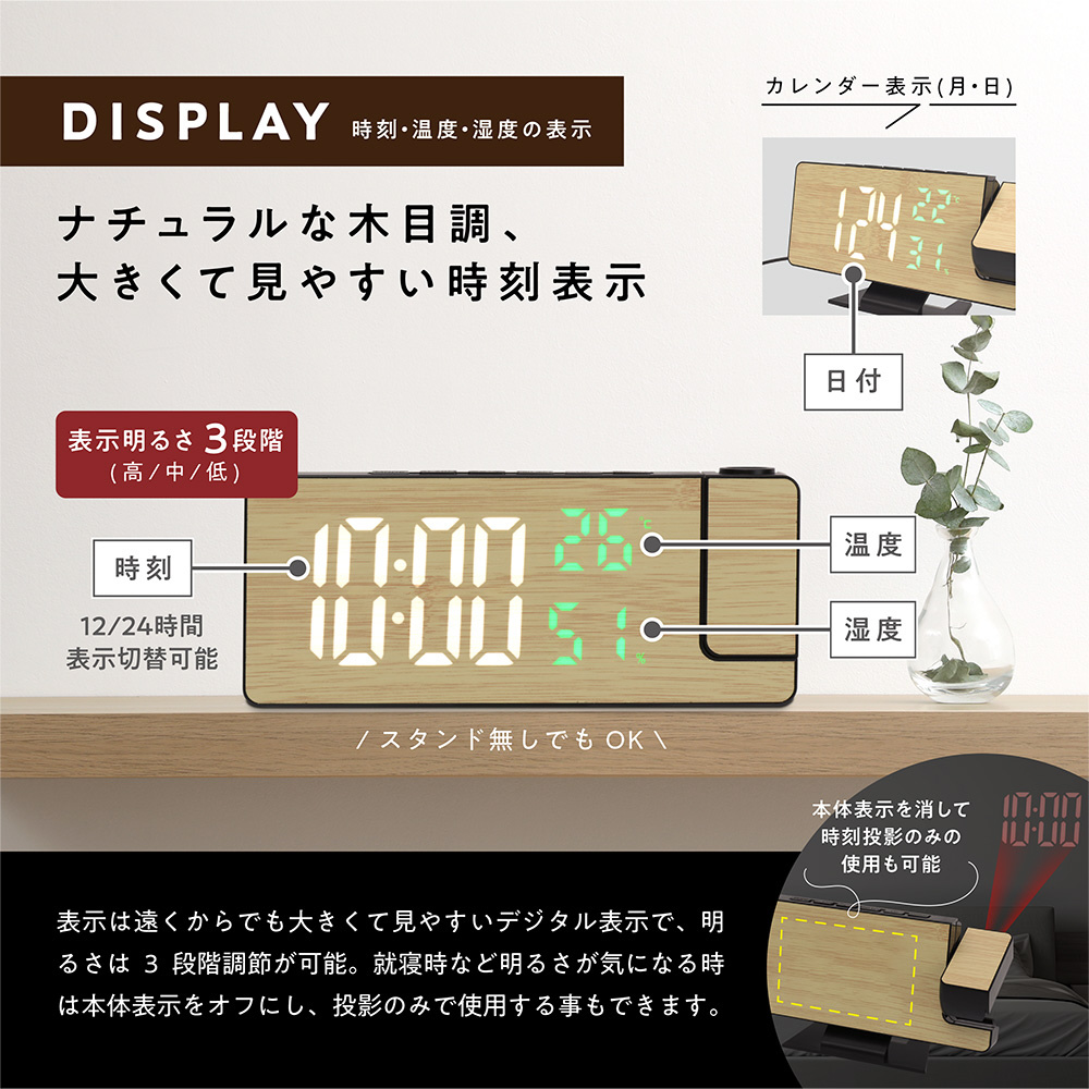 ■ 本体表示を消し、プロジェクターのみでの使用も可能・スヌーズ付きアラーム搭載で目覚まし時計としても使えます。