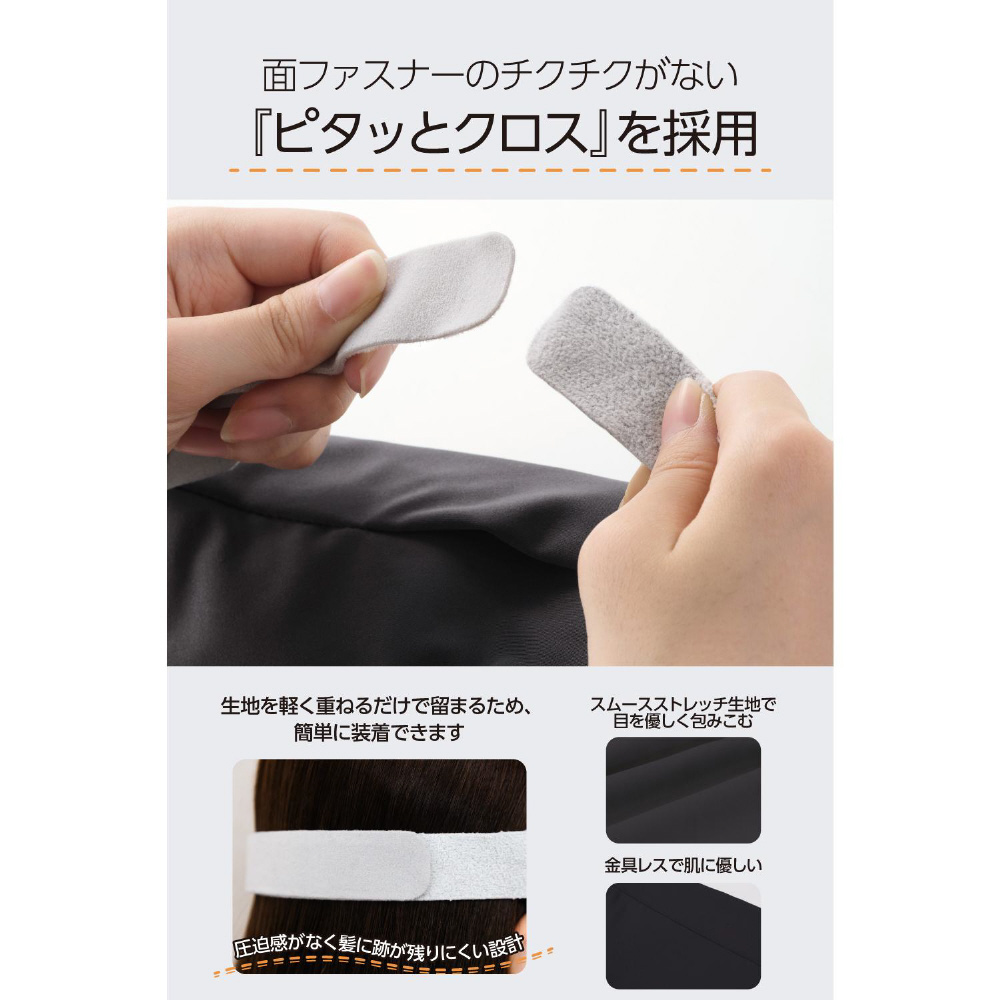 リラックスホールド縫製で長時間着けていても目や耳を圧迫せず、顔に優しくフィットします。また、ベルトの調節金具やファスナーなどの硬い素材も極力取り除き、快適なリラックスタイムの実現にこだわり抜いた着け心地です。