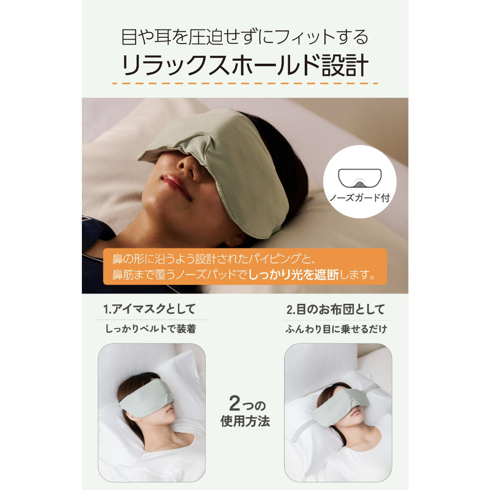 ベルトでしっかり装着してアイマスクとして、目にふんわりと乗せて目のお布団として使える2WAYタイプです。