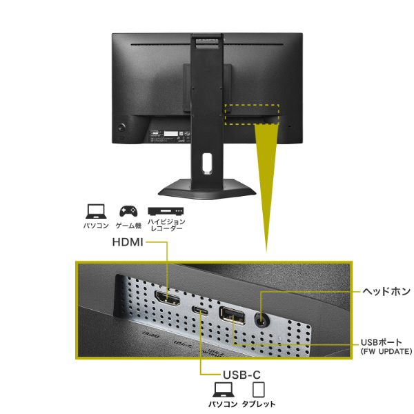 USB Type-C端子のほかにも様々な機器と接続できるHDMI端子や、給電可能なUSBポート(FW UPDATE)も搭載しております。