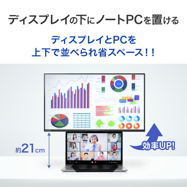 スタンドは150mmまで高さ調整できるので、ノートPCと上下に並べて配置することで、省スペースで使用できます。