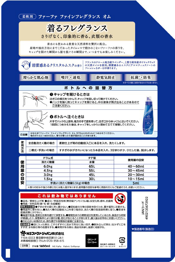 【ケース販売】FaFa(ファーファ) ファインフレグランス オム 詰替1400ml×6