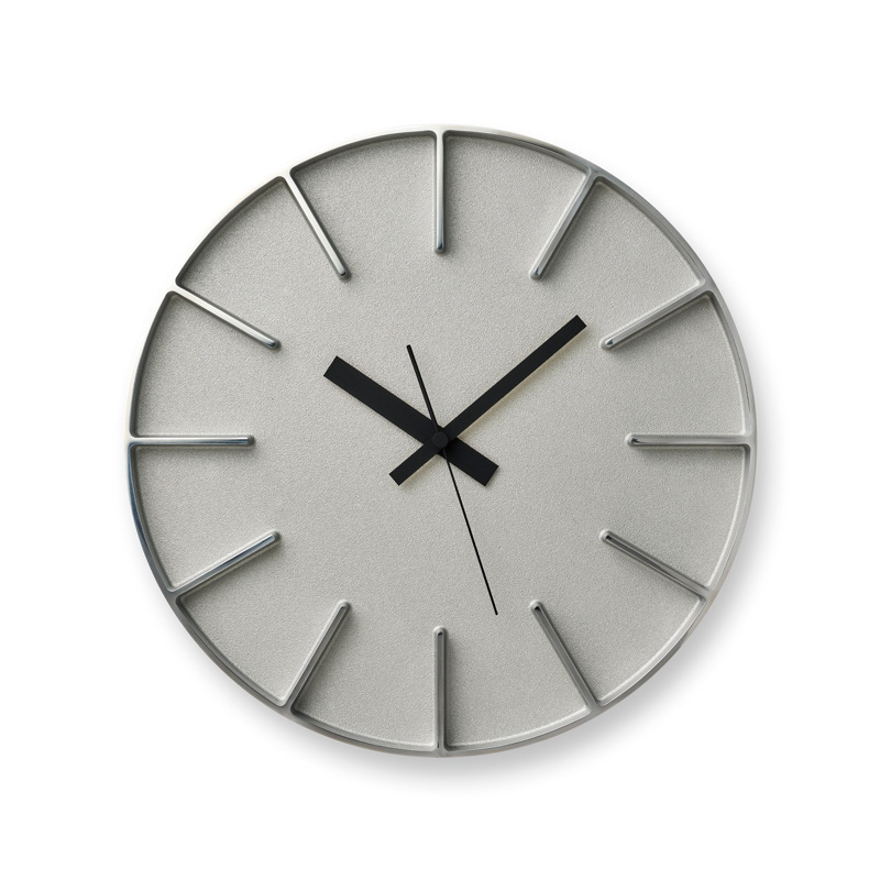 AZUMI によるアルミニウムクロック。アルミ一体成型の豊かな品質とシンプルで力強いデザインが特徴です。アルミの素材感と丁寧に磨き上げられたインデックスが美しく融合され、シャープな印象を与えます。