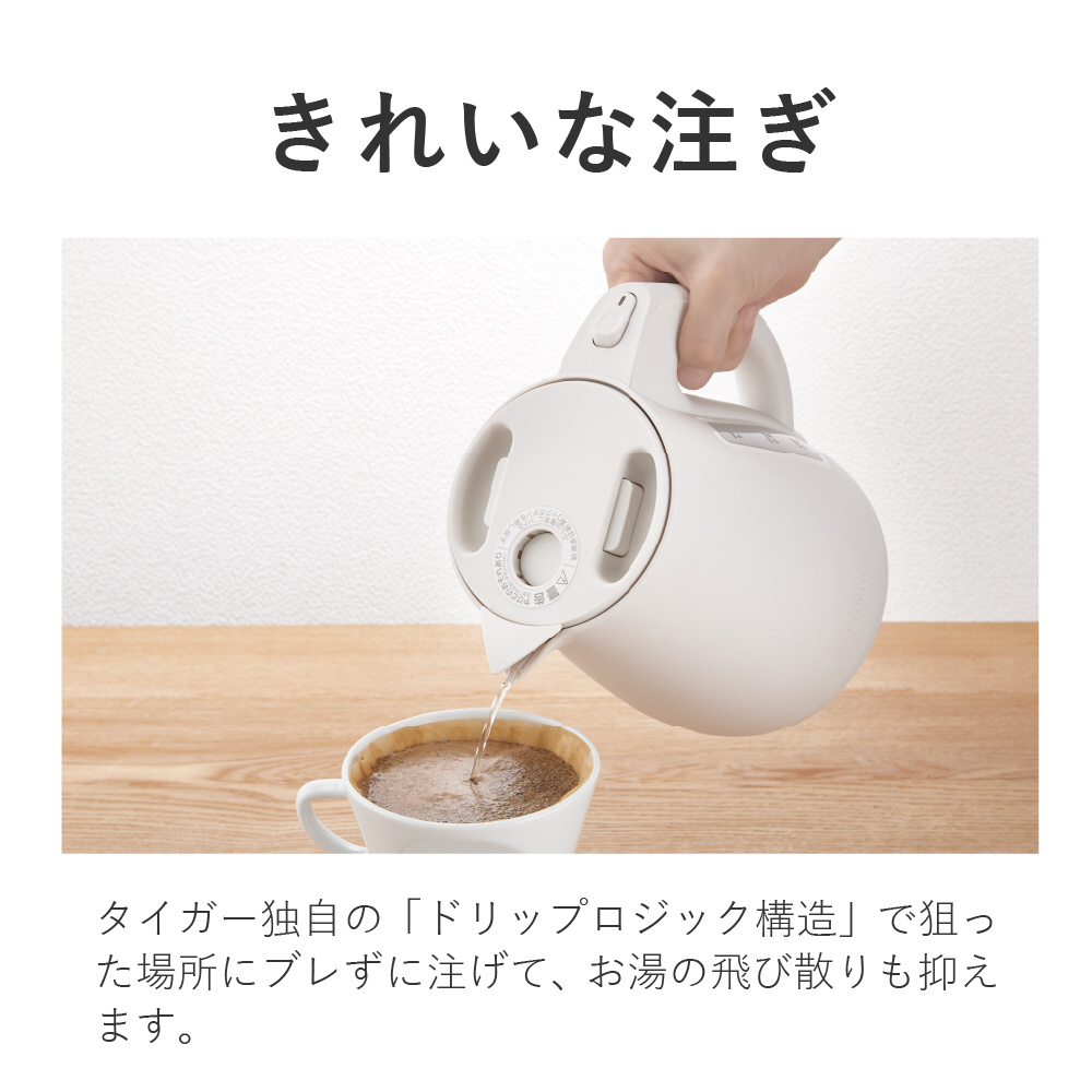 タイガー独自の「ドリップロジック構造」で狙った場所にブレずに注げて、お湯の飛び散りも抑えます。