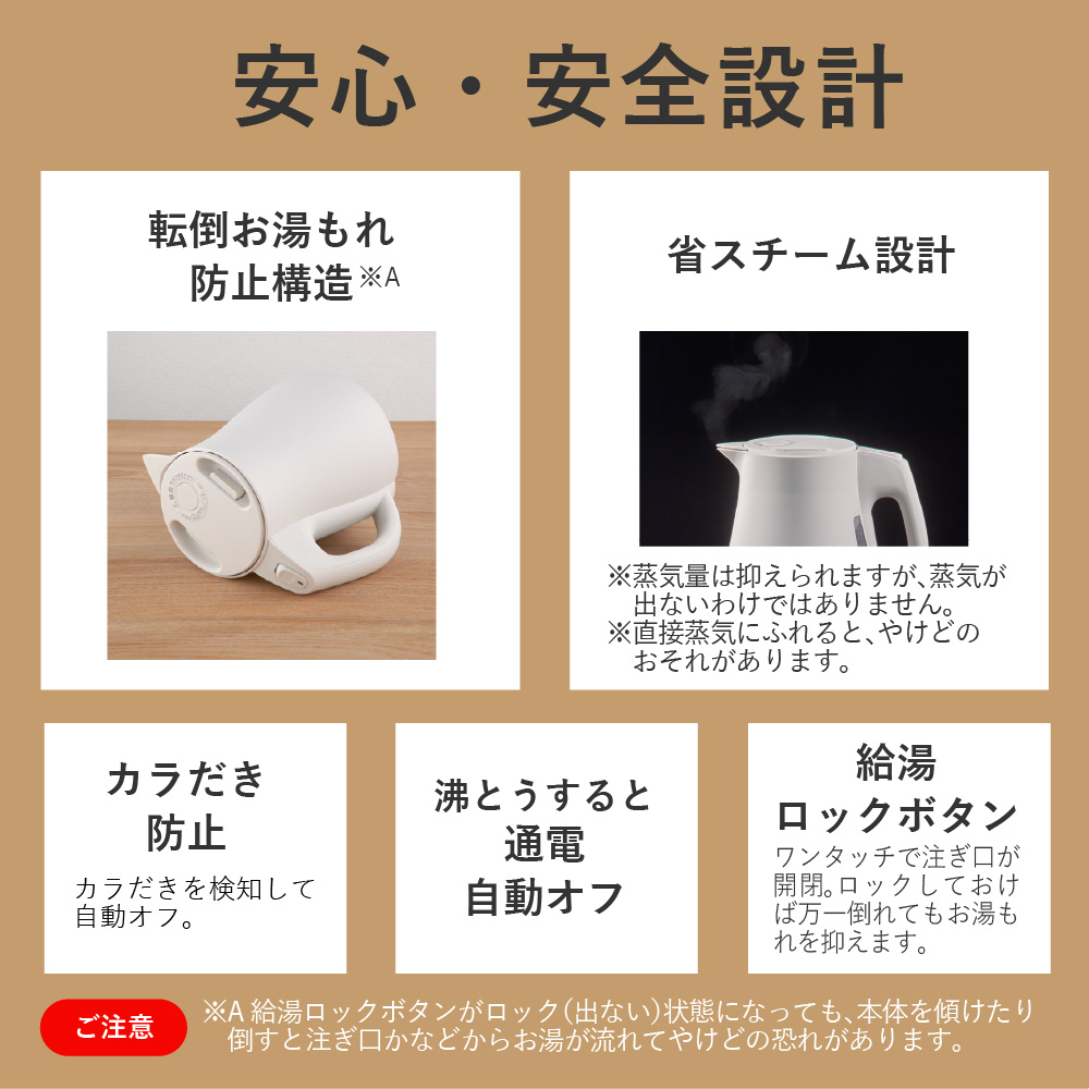 ロックしておけば、万一倒れても注ぎ口からのお湯もれをおさえます。