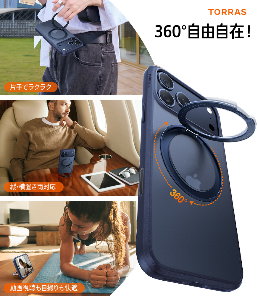回転式スタンドが背面に搭載されたOstand Proは、縦置き・横置き自由自在。MagSafe対応で充電もスムーズ。使いやすさと美しさを両立した高機能ケースです。