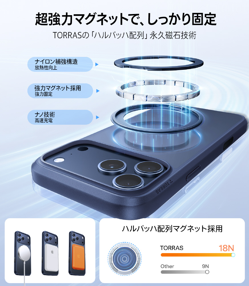 ・TORRAS独自の「Halbach」マグネット技術で、N52マグネットブラケット38個が内蔵され、磁力は18N、MagSafeアクセサリーに対応。